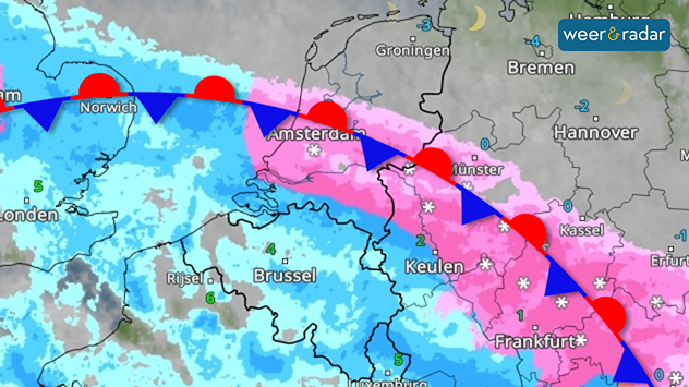 Na een licht winters weekend met op zondag zelfs wat sneeuw blijft het de komende dagen vrij koud. Maandagochtend valt in het noordoosten nog wat (natte) sneeuw, maar al snel valt er daar net als in de rest van het land geregeld regen. ’s Middags is het 4 tot 8 graden en er staat een stevige zuidwestenwind.