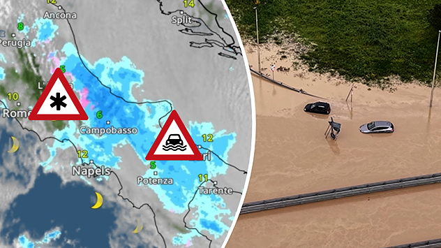 Links is de weerradar met sneeuwval in de Alpen te zien, rechts een winters berglandschap.