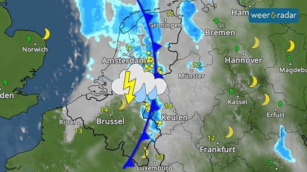 Van donderdag op vrijdag nemen de onweerskansen tijdens de passage van een weerfront toe.