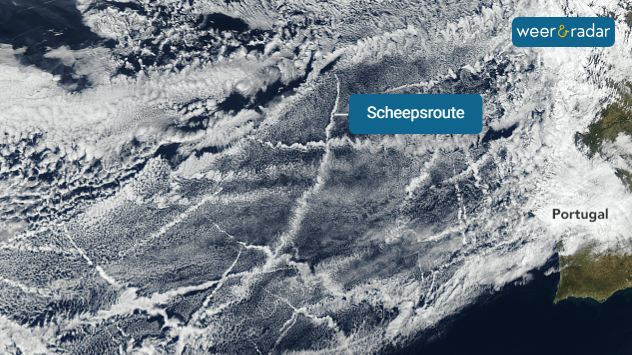 Weerkaart met regen- en windvelden boven de Canarische Eilanden en centraal waarschuwingssymbool.