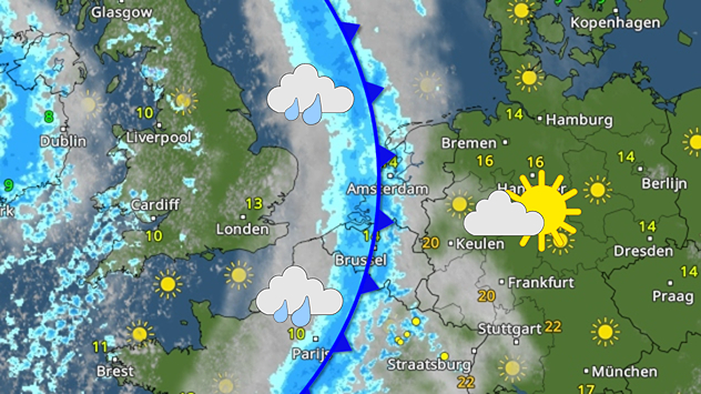 Roze bloeiende kersenbomen in een straat naast de weerradar, met zon en temperaturen rond de 19 graden bij Bonn.