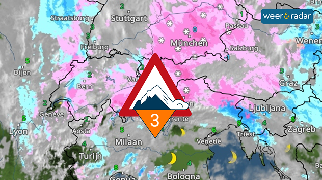 WeerRadar: Op donderdag valt er in het Alpengebied op grote schaal sneeuw. Door de verse sneeuw en de wind neemt het lawinegevaar toe.
