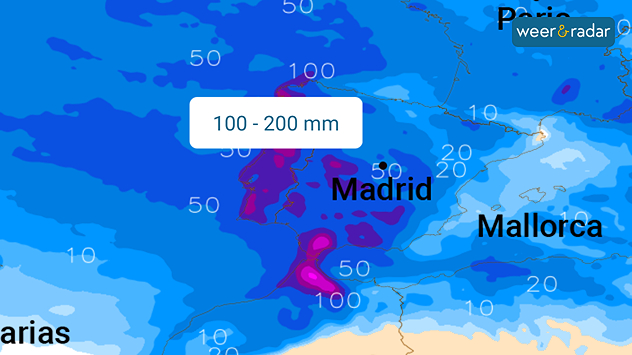 Vooral in het noorden van Portugal en het noordwesten van Spanje vallen regionaal grote hoeveelheden regen. Tot het einde van de week valt daar ruim 100 millimeter. Lokaal zijn zelfs tussen de 200 en 300 millimeter mogelijk.
