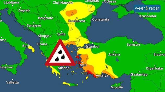 Vrijdag gelden er forse waarschuwingen voor grote delen van de Balkan en Griekenland, zaterdag schuift het noodweer op naar het oosten van de Balkan en het westen van Turkije.