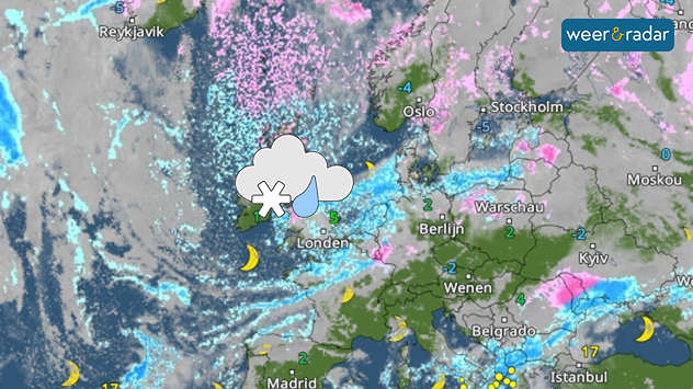 WeerRadar: Er zijn veel regen- en sneeuwbuien boven Noord- en West-Europa te vinden.