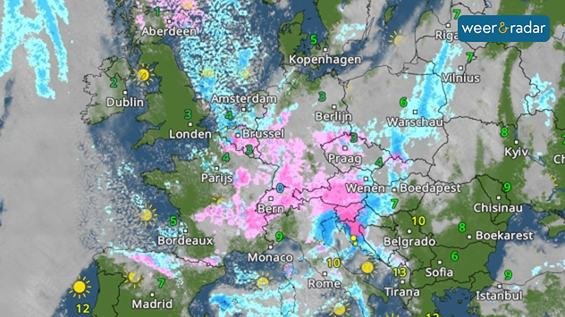 WeerRadar: Halverwege de week valt er naast regen ook hagel en (natte) sneeuw. In de Alpen wordt het zeer winters.