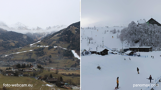 Lagerop in Matrei in Osttirol is het groen (links) en in Prato Nevoso in Piemonte is er een dik pak sneeuw gevallen (rechts).