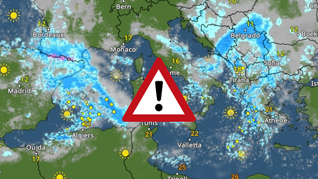 Weerkaart met waarschuwing voor zware regenval voor de westelijke Balkan en de Adriatische kust.