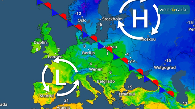 Milde lucht in Zuidwest-Europa staat tegenover koude poolwind in Noordoost-Europa.