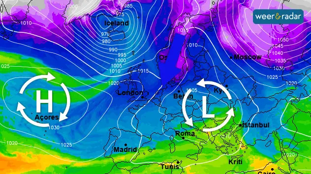 De weerkaart voor eind van de week tootn een omvangrijk hogedrukgebied boven de Baltische Staten, die ook bij ons voor rustig lenteweer met veel zon zorgt.