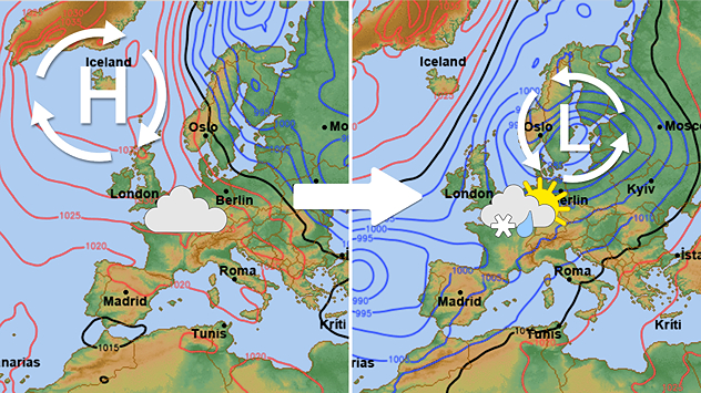 's Nachts heeft een dikke laag sneeuw de hut bedekt, naast welke een weerkaart hangt met sneeuwsymbolen boven de Alpen en Noord-Italië.