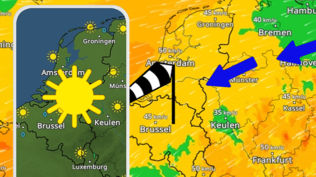 Regenradar boven Zuid-Frankrijk naast foto van een overstroomde straat. Waarschuwingsbord symboliseert gevaar voor overstromingen en aquaplaning.