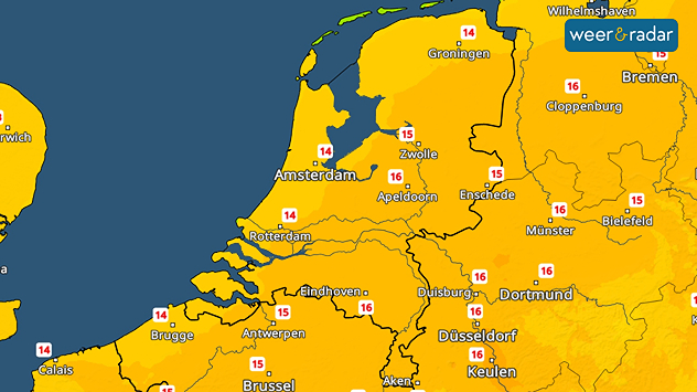 De TemperatuurRadar geeft voor maandagmiddag 14 tot 16 graden aan. Aan zee blijft het koeler.