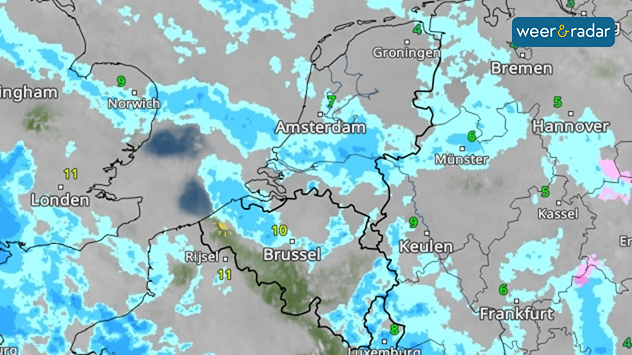 Op de WeerRadar is het goed zichtbaar: vandaag volgt vanuit het zuiden wat regen. De temperaturen liggen daarbij een stapje hoger met in het midden van het land rond de 7 graden en in het zuiden tot maximaal 10 graden.