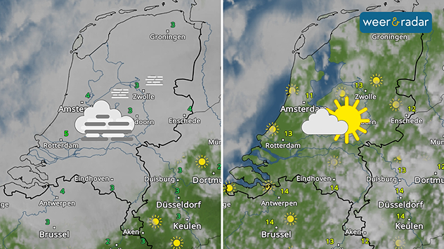 Zaterdag start op de meeste plaatsen met laaghangende bewolking of mist. In de loop van de ochtend klaart het op de meeste plaatsen op, maar in het noorden kan de bewolking vrij hardnekkig zijn. Voor de middag toont de WeerRadar een mix van wolken en zon. Het wordt daarbij 12 tot 14 graden, in het noorden blijft het door de bewolking koeler.