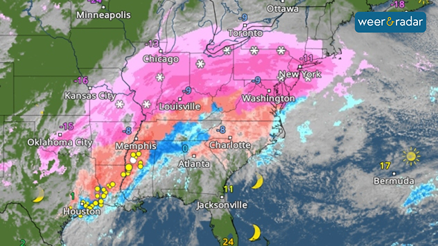 De WeerRadar toonde de hevige ijzel boven het zuiden van de Verenigde Staten.