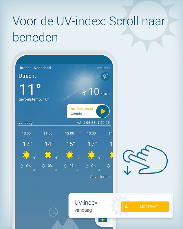 Met de Weer&Radar app blijf je helemaal op de hoogte van de actuele UV-index en meer gedetailleerde informatie: