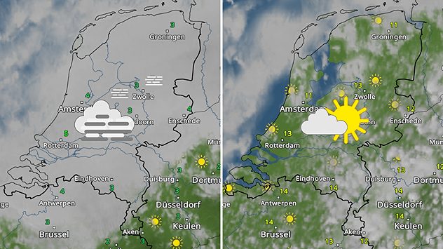 Vandaag wisselen zon en wolken elkaar af, daarbij blijft het droog. De temperatuur ligt in de komende uren rond de 4 graden.